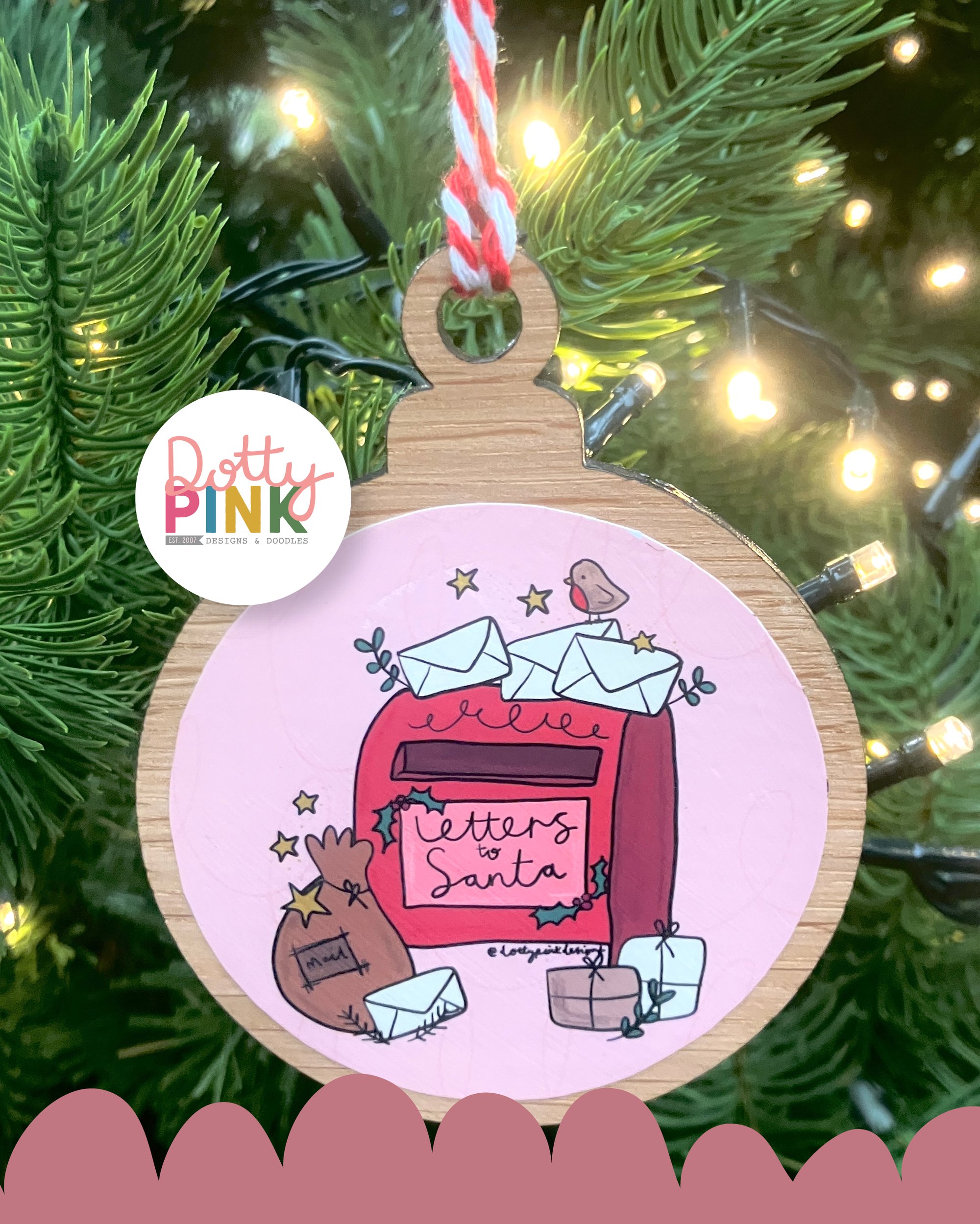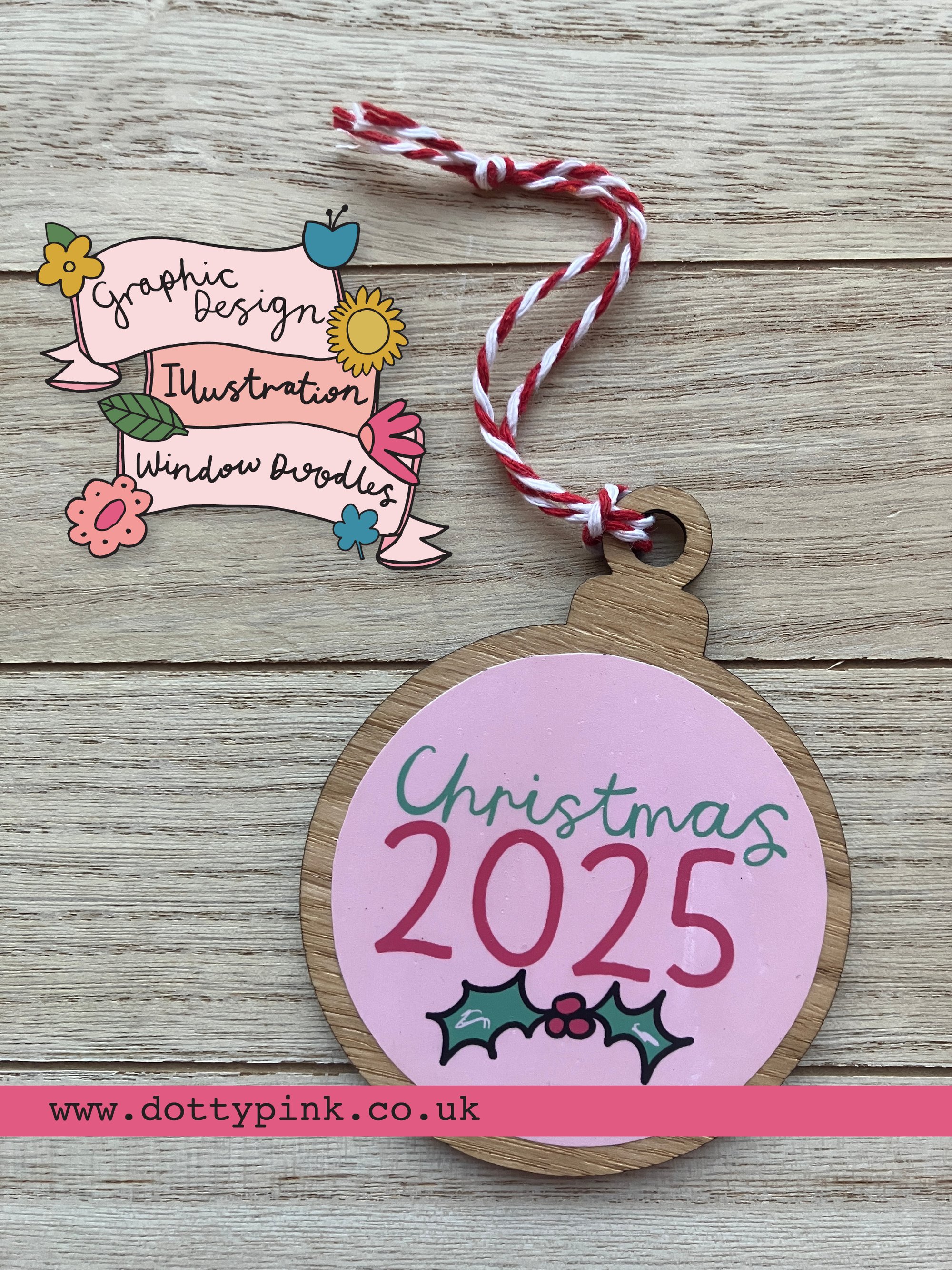 The illustration is on one side and ‘Christmas 2025’ is on the back in a matching colour. They come with a red and white twine ready for hanging your tree!