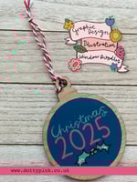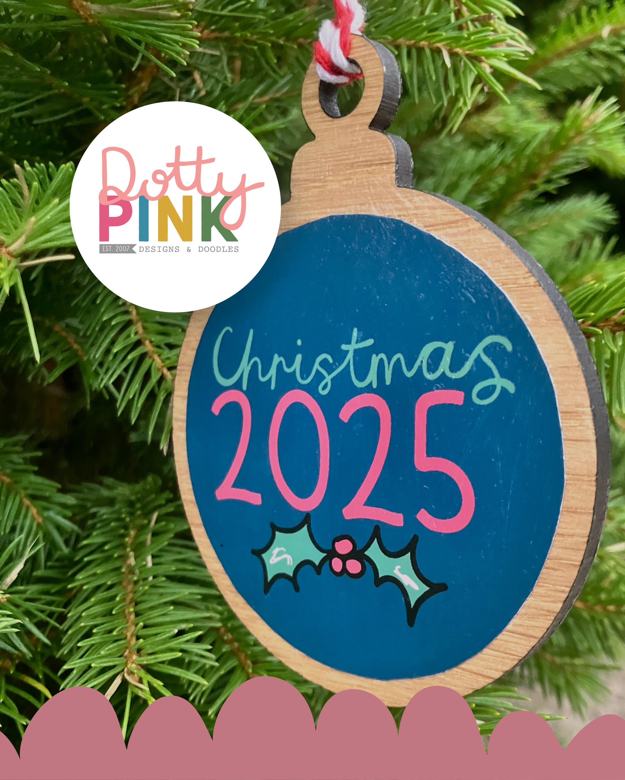 The illustration is on one side and ‘Christmas 2025’ is on the back in a matching colour. They come with a red and white twine ready for hanging your tree!